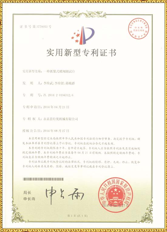 安全閥試驗(yàn)臺(tái)專(zhuān)利證書(shū) 蝶閥試壓臺(tái)專(zhuān)利證書(shū)