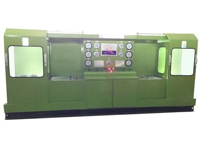 本機(jī)由液壓系統(tǒng)、機(jī)械部件,電器控制及多極氣源升壓裝置系統(tǒng)等部件組成。液壓系統(tǒng)是本試驗(yàn)臺(tái)的動(dòng)力主源。用于各類(lèi)液壓缸和機(jī)械件驅(qū)動(dòng)執(zhí)行功能。試驗(yàn)面夾爪由液壓缸直接驅(qū)動(dòng)執(zhí)行,軸向夾緊壓力是按閥門(mén)試驗(yàn)壓力等級(jí)不同進(jìn)行調(diào)節(jié)增壓(最高液壓增壓壓力31 5MPa)。各夾爪受力均,夾緊可靠。徑向移動(dòng)由液壓缸傳動(dòng)執(zhí)行,各夾爪進(jìn)退同步,靈活自如,確保通徑大小不同閥門(mén)的測(cè)試。多極氣源升壓裝置是利用液氣聯(lián)動(dòng)增壓。增壓范圍0.6—32 0MPa,用于閥門(mén)介質(zhì)壓力試驗(yàn)。氣源升壓工作設(shè)有自動(dòng)和手控二種操作選擇,當(dāng)選用自動(dòng)升壓工作時(shí),工作人員可以近距離離開(kāi)操縱臺(tái)觀察現(xiàn)場(chǎng)試驗(yàn)情況。